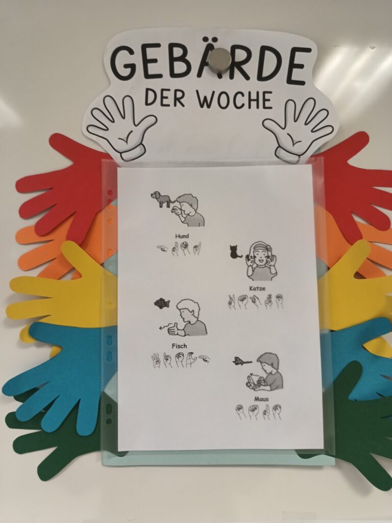 Diese Woche lernen die Kinder die Gebärden für die Tiere „Hund“, „Katze“, „Fisch“ und „Maus“.