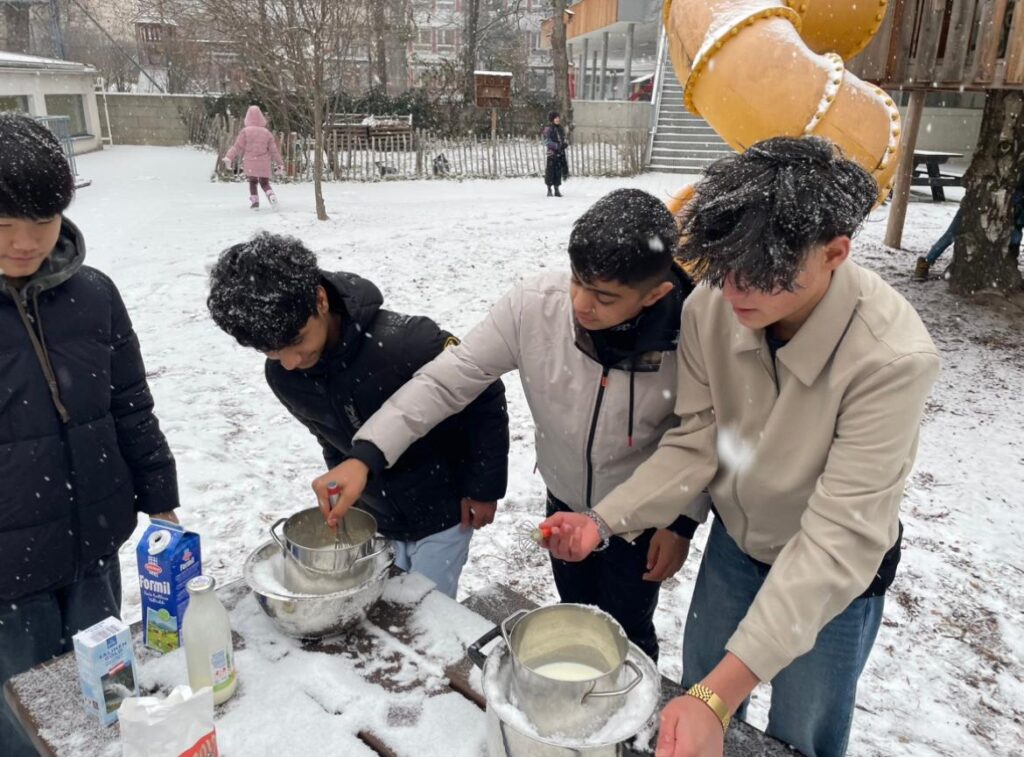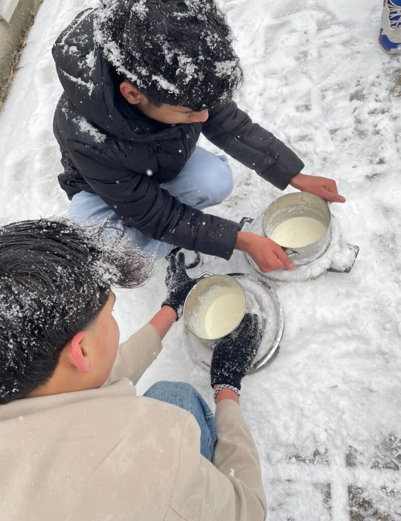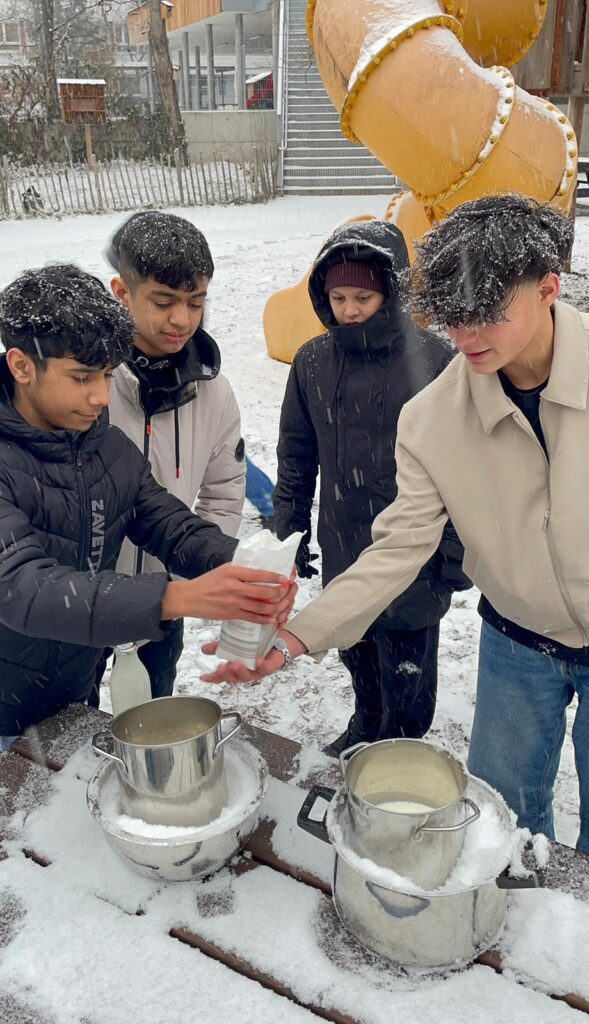Passend zum Schnee haben wir in der Deutschklasse heute etwas richtig Cooles gemacht – im wahrsten Sinne des Wortes: Wir haben Eis im Schnee hergestellt. Milch, Zucker und Obers kamen in eine Schüssel, die wir draußen in den Schnee gestellt haben. Durch ständiges Drehen wurde die Mischung langsam fest – und wir dabei erstaunlich warm